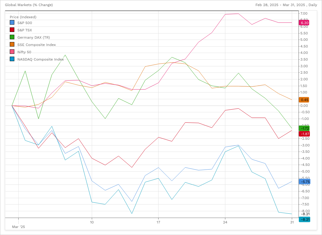 North American stock markets declined during the month of March as investors panicked about weaker global growth and higher inflation spurred by the Trump tariffs. Last month, the U.S. Market (S&P 500) was down -5.75% while the Canadian market (S&P/TSX Composite Index) was down -1.87%. The U.S. Nasdaq Composite index which contains a high weighting of technology related stocks was down -8.21%. The German stock market (Dax40) declined -1.72%, while the Chinese market (Shanghai Composite Index) increased by 0.45% and the Indian market (Nifty 50 Index) was up 6.3%.