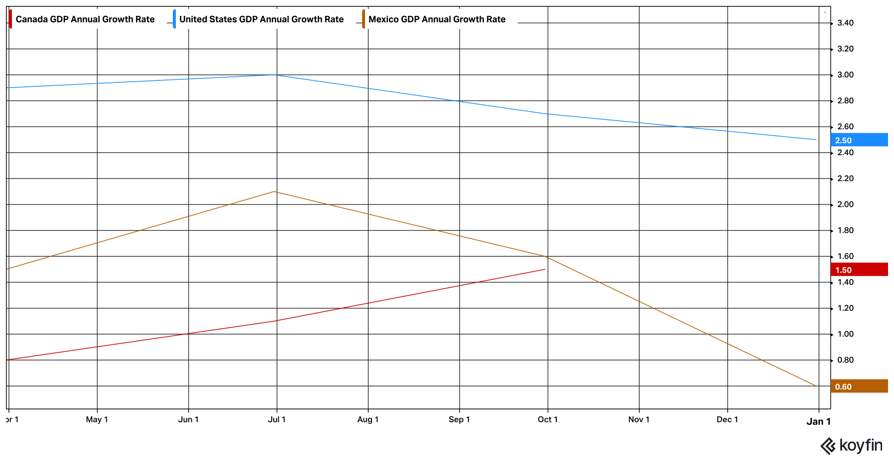 Although the U.S. economy is growing at the fastest rate (2.5%) among its North American peers, its pace of growth has slowed in the last year. On the other hand, Canada’s economic growth rate has sped up from near zero to 1.5% (up to the 3rdquarter of 2024). Mexico’s economy is declining towards no growth at 0.6%.
