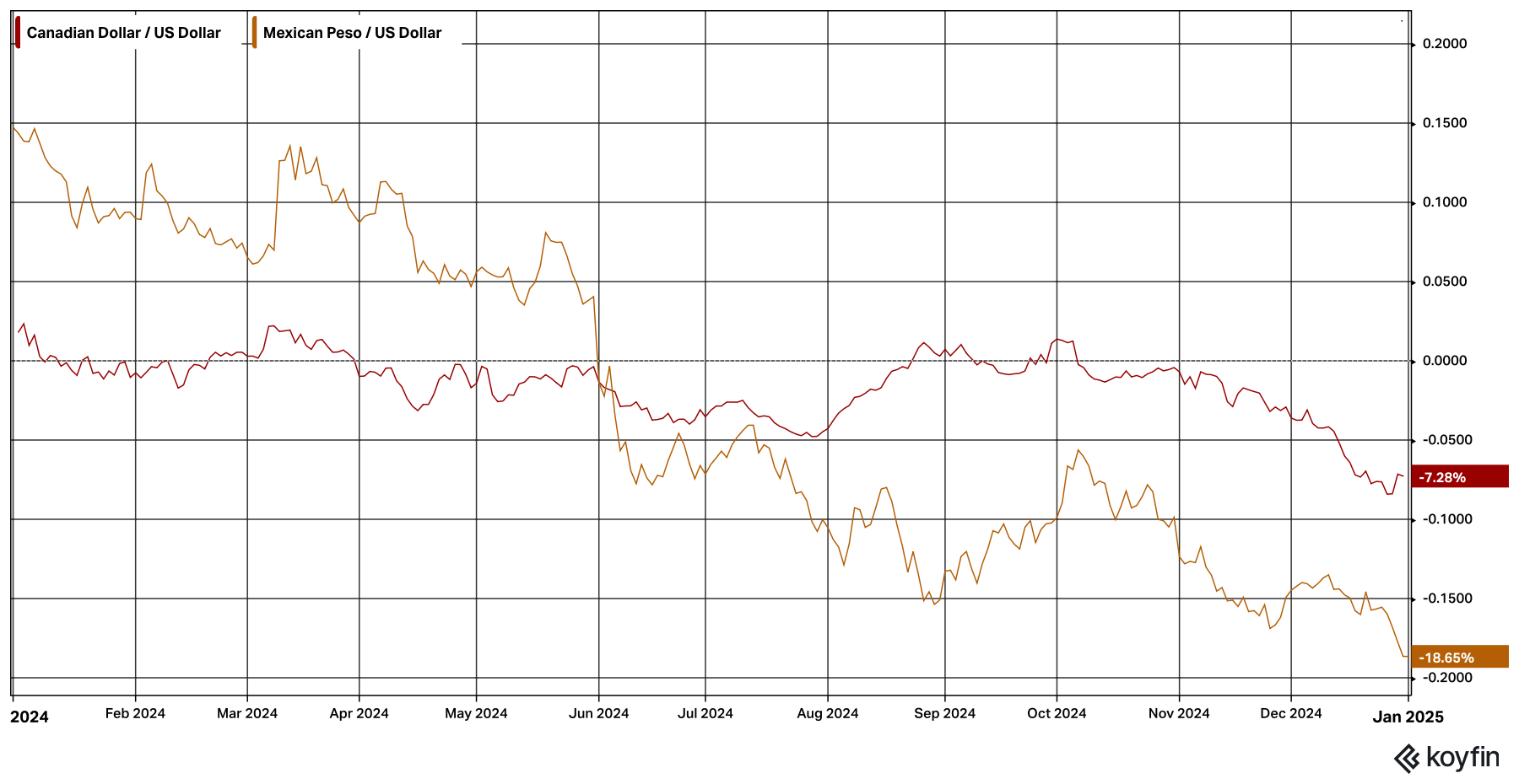 The outperformance of the American economy combined with the relatively higher U.S. Federal Funds rate has strengthened the U.S. dollar. The Canadian dollar fell -7.28% against the U.S. Dollar in the last 12 months, while the Mexican Peso fell by -18.65% over the same period.