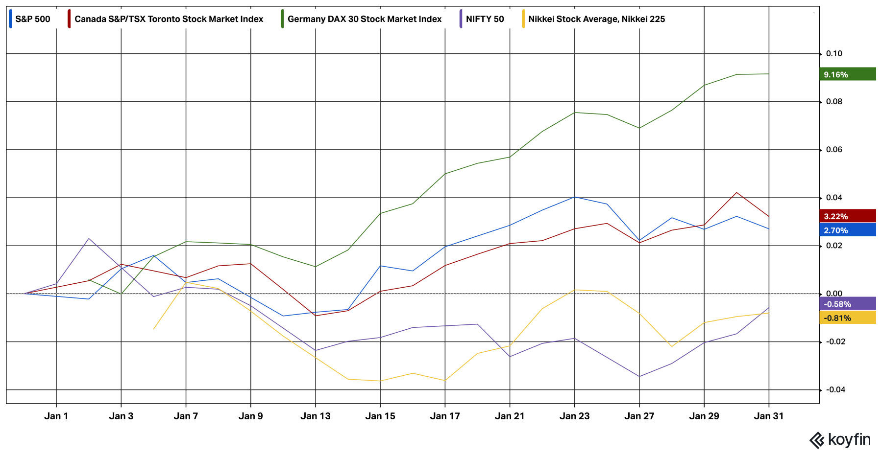 Global stock markets had a positive month in January. In North American the Canadian market (S&P/TSX Composite Index) was up 3.26% and the U.S. market (S&P 500) was up 2.70%. European stock markets outperformed their North American counterparts with the UK market (FTSE100) up 6.13%, France’s market (CAC 40) rallied 7.72% and the German market (DAX 30) skyrocketed by 9.16%. Most Asian markets did not make any gains in January, with some markets like India and Japan experiencing slight declines.