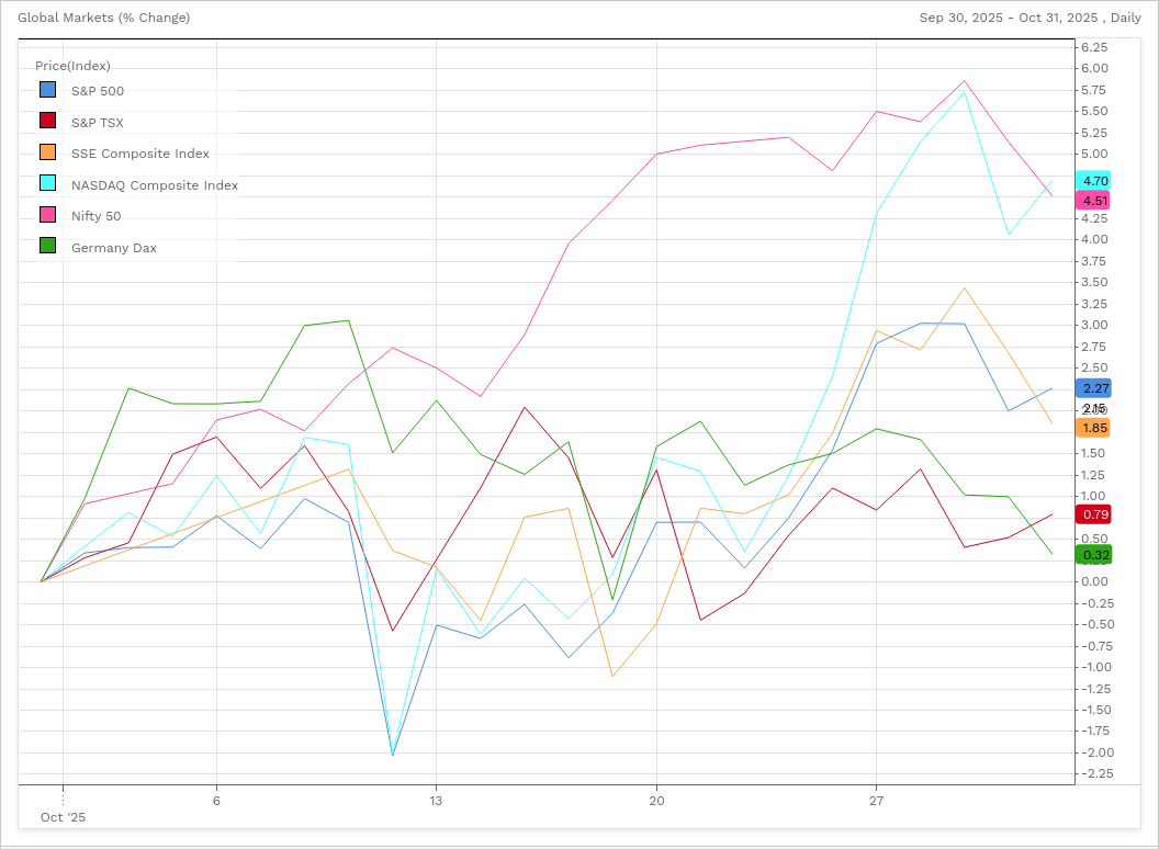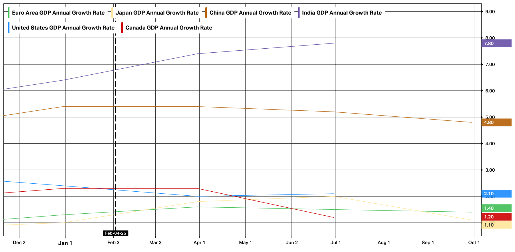 | Economy Global Annual GDP Growth Rates after Trump’s Tariffs Declining Economies (among the six economies in our tracking) Change in Economic Growth after Trump’s Tariffs United States-0.4% Canada-1.1% China-0.6%Japan-0.2% Global Economic Growth (Annual GDP Growth Rate) – 1 Year Chart (*Dotted line shows the start of Trump’s Tariffs, February 4th) The U.S. economy’s (blue) annual growth rate declined from 2.5% to 2.1%. The Canadian economy’s (red) annual growth rate declined from 2.3% to 1.2%. China’s annual economic growth rate (brown) fell from 5.4% to 4.8%. The Eurozone’s annual economic growth rate (green) increased from 1.2% to 1.4%. The Japanese annual economic growth rate (yellow) declined from 1.30% to 1.10%. India’s annual economic growth rate (purple) increased from 6.4% to 7.8%. Global Annual Inflation Rates after Trump’s Tariffs Rising Inflation (among the six economies in our tracking) Economies with Rising Inflation after Trump’s Tariffs Canada+0.3% Global Inflation Rates (Annualized) – 1 Year Chart (*Dotted line shows the start of Trump’s Tariffs, February 4th) Since Trump’s Tariffs were implemented the inflation rate for all the tracked economies have moved lower except Canada and the United States. Canada’s inflation rate (red) has increased from 1.9% to 2.2%. The United States’ inflation rate (blue) is unchanged at 3.0%. The Eurozone inflation rate (green) fell from 2.5% to 2.1%. China’s inflation rate (brown) declined from 0.5% to 0.2%. Japan’s inflation rate (yellow) fell from 4.0% to 3.0%, and India’s inflation rate (purple) fell from 4.26% to 0.25%. United States Please note: Due to the United States Government shutdown which started October 1, 2025 and ended on November 12, 2025, government agencies that prepare official United States’ economic data are still in the process of updating their latest reports, as a result, most of October’s data is either delayed or will not be generated. The most recent jobs data released for the month of September, provided further evidence of the slowing pace of job growth in 2025. The U.S. generated 119,000 jobs in September, rebounding from a decline of -4,000 jobs in August. The unemployment rate rose to 4.4% in September from 4.3% in August. The rate of Inflation is moving further away from the U.S. Federal Reserve’s 2% target. The latest U.S. inflation data for the month of September, showed that the inflation rate moved up to 3.0%, from 2.9% in August. The next inflation update for the month of November will not be reported until December 18th. Coincidentally, the release date for November’s, widely read job report will be delayed from December 5th, until December 16th. The release dates of both the U.S. jobs and inflation reports will mean that the U.S. Federal Reserve will not have up-to-date information for these critical data points, before deciding whether a third consecutive rate cut is warranted in their next interest rate decision meeting on December 10th. Delayed data on consumer spending habits for the month of September was released today (November 25th). Consumers continue to spend, although at a slower pace, as retail sales grew by 0.2% compared to 0.6% in August. Canada The Canadian economy had another phenomenal month of job growth in the month of October. After generating 60,400 additional jobs in September, Canada generated 66,600 additional jobs in October. A large majority of the new jobs in Canada were part-time, in wholesale and retail trade, transportation and warehousing, information culture and recreation, as well as the utilities sector. Another positive development for the Canadian labour market was that the unemployment rate fell in October, from 7.1% to 6.9%. After cutting back on spending in September, Canadian consumers kept their wallets and purses shut in October, as retail sales growth was flat (0%) for the month. The Canadian inflation rate shifted closer to the Bank of Canada’s target rate (2%), as it fell from 2.4% to 2.2% in October. During, their last interest rate decision meeting on October 29th, the Bank of Canada had some concerns about the level of inflation remaining elevated, but they were more concerned about the impact of tariffs on the economy, so they decided to cut rates. The Bank of Canada will meet again on December 10th. Tariffs Tariff Reductions On November 10th, the United States reduced Chinese tariffs by 10% as part of the ongoing trade negotiations between the two countries. The Trump administration announced tariff exemptions (beginning November 13th) on a range of agriculture products from Ecuador, Argentina, El Salvador, and Guatemala. The exempted goods include coffee, tea, tropical fruits and juices, cocoa, spices, bananas, oranges, tomatoes, beef, and some fertilizers. On November 14th the U.S. announced a trade deal with Switzerland and Liechtenstein that lowers the “reciprocal tariff rate” for these two countries from 39% to 15%. Markets Global Stock Markets During the month of October, the U.S. Market (S&P 500) was up 2.27%, while the Canadian market (S&P/TSX Composite Index) grew by 0.79%. The U.S. Nasdaq Composite index which contains a high weighting of technology related stocks had another strong month and increased by 4.70%. The German stock market (Dax 40 index) was up by a mere 0.32%. The Chinese market (Shanghai Composite Index) was up 1.65% and the Indian market (Nifty 50 Index) was up a robust 4.51%. Change in Global Stock Markets the Month of October 2025 Source: FactSet® So far in November, market volatility has increased as investors express concerns about an AI bubble. Investors are also undecided about the likelihood of continued U.S. Federal Reserve interest rate cuts. In November, we received positive earnings reports from many of the most valuable U.S. listed stocks, such as Nvdia, Google, Apple, and Walmart to name a few, but some investors are still concerned that market valuations are 