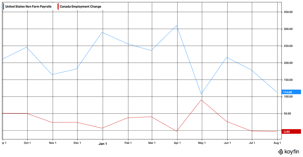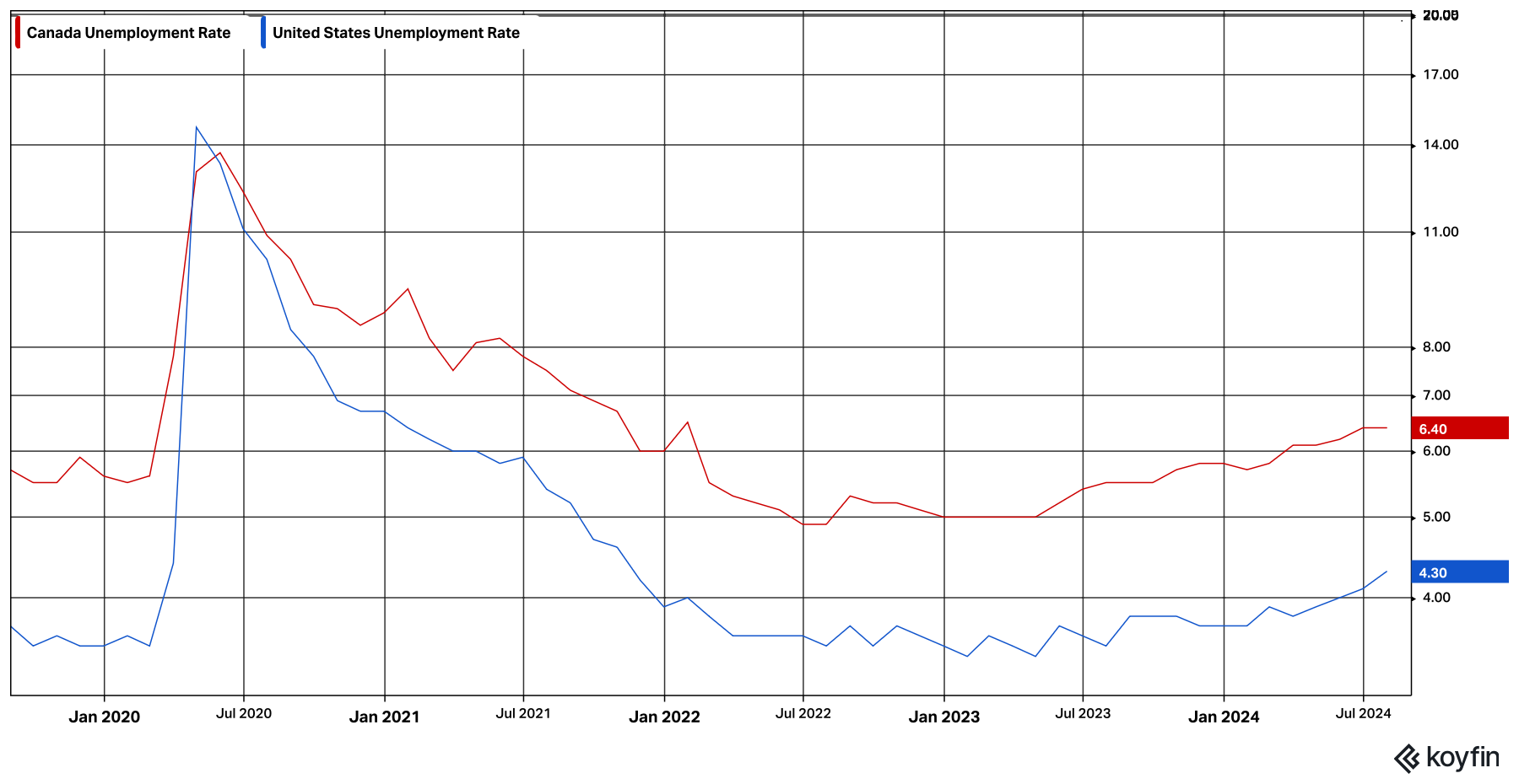 The question on many economists’ minds is: whether the U.S. economy is headed for a crash or just a slowdown? By many measures, the U.S economy is still showing signs of continued growth. Second quarter economic growth as measured by GDP was revised upward last month to 3.0%. In its latest reading last month, retail sales rebounded by 1.0%, after showing no growth (0%) the previous month. Also, inflation’s drag on the U.S. economy lessened last month as consumer inflation fell from 3.0% to 2.9%.  The area of the U.S. economy that has many economists concerned is the labour market. Last month, the U.S. economy generated a relatively low 114,000 jobs, while the unemployment rate increased from 4.1% to 4.3. The last time in recent years we saw job growth this weak was this April at 104,000 jobs. The unemployment rate has been on a steady climb since January when it was 3.7%. At 4.3%. The unemployment rate is still historically low, but it is well above the 3.5% achieved in February 2020, before the pandemic started. Over the next coming months as inflation becomes less of a concern, the labour market will be the focus of the United States Federal Reserve. It is likely that the U.S. Federal Reserve will begin cutting interest rates in their meeting on September 18th.
